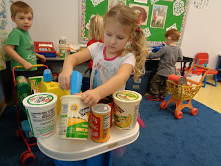 play as they engage one another within the roles of shopper and cashier. Social skills are reinforced as the children
